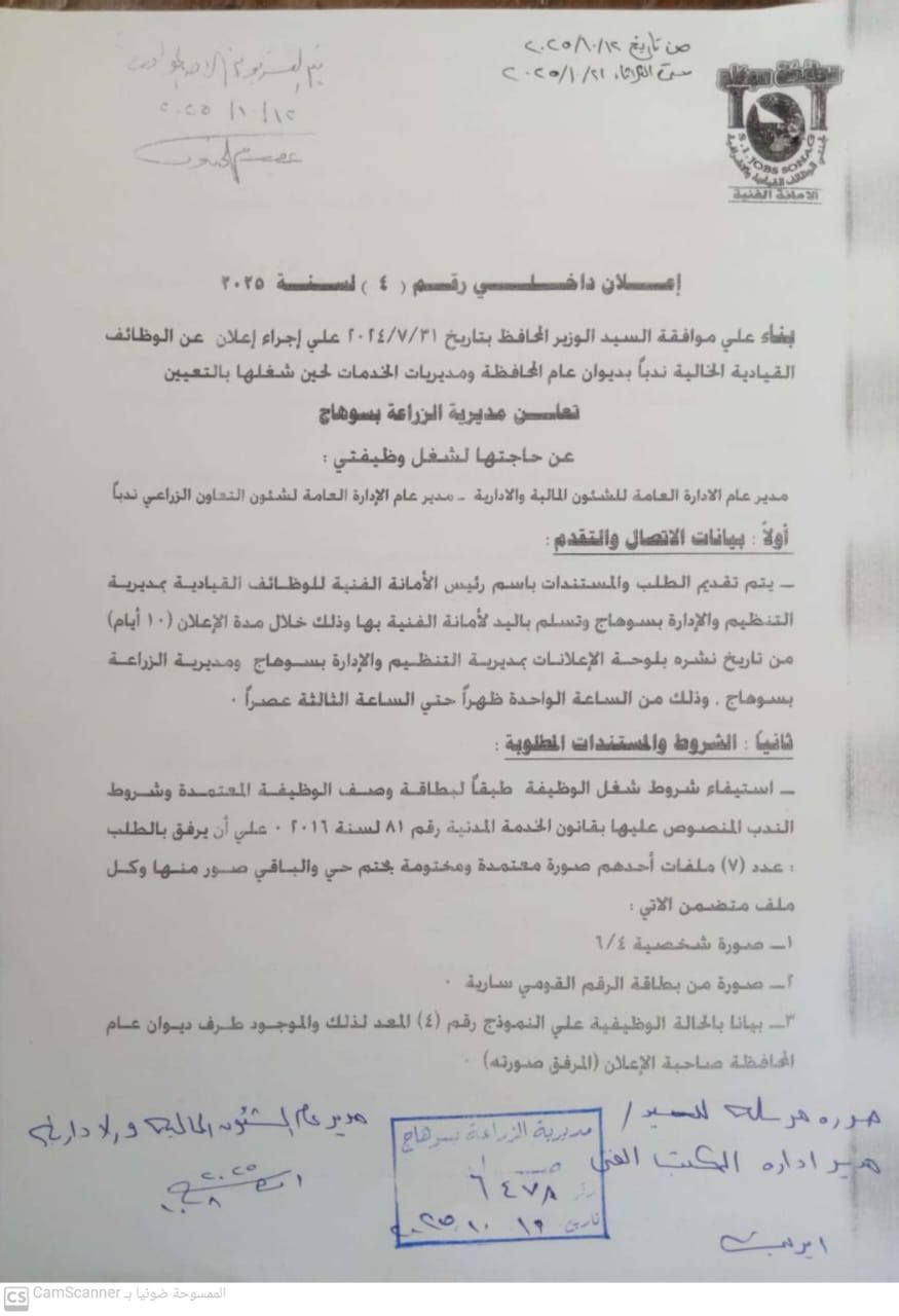 الأربعاء، 15 أكتوبر 2025 07:00 صأعلنت مديرية الزراعة بمحافظة سوهاج عن حاجتها لشغل عدد من الوظائف القيادية الخالية بديوان عام المديرية، وذلك في إطار موافقة اللواء طارق الفقي محافظ سوهاج، على الإعلان رقم (4) لسنة 2025 الصادر بتاريخ 12 أكتوبر 2025.