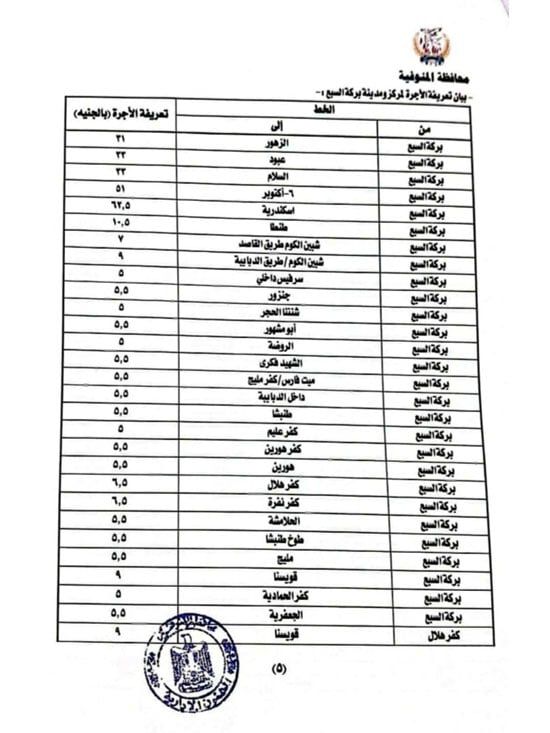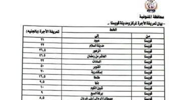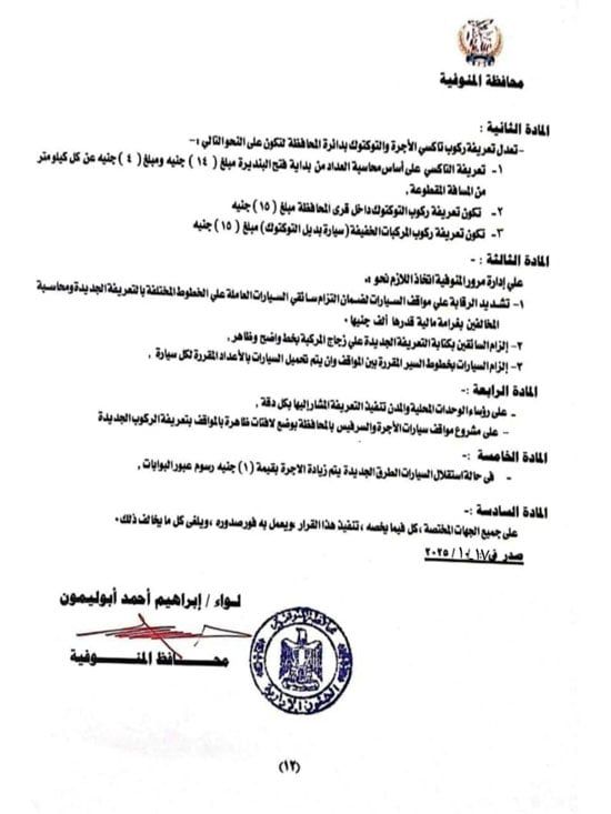 هذا وتضمنت المادة الثانية من القرار تعديل تعريفة ركوب التاكسي على أساس محاسبة العداد من بداية فتح البنديرة بمبلغ 14 جنيها ومبلغ 4 جينهات، عن كل 1 كيلو متر من المسافة المقطوعة ، و15 جنيها تعريفة الركوب الجديدة لمركبات التوكتوك داخل قري المحافظة.