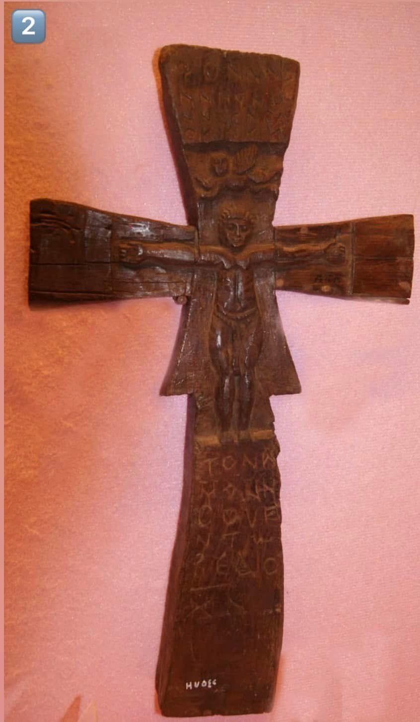 وكذلك صليب احتفالي من الخشب المغطى بطبقة من الجلد يعود إلى العصر القبطي، يتميز بوجود تصوير لهيئة آدمية في أسفله، إلى جانب أربعة رموز تمثل الأناجيل الأربعة، وكان هذا النوع من الصلبان يُستخدم كزخرفة توضع على كرسي البطريرك خلال الاحتفالات الدينية.
