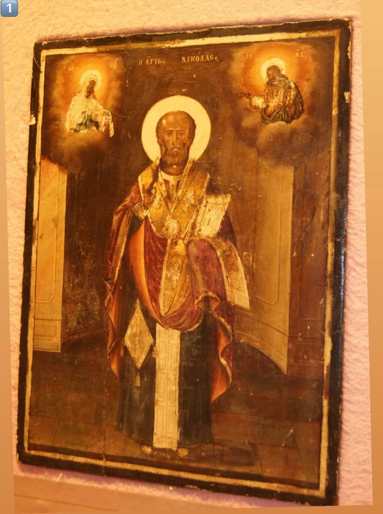الأيقونة الخشبية للقديس نيقولاس (سانتا كلوس)، المصنوعة من الخشب الملون، والتي تجسد شخصية القديس المعروف بعطائه للفقراء والمحتاجين في الخفاء، والذى شغل القديس نيقولاس منصب أسقف مدينة ميرا، الواقعة حاليًا في تركيا، وتعود الأيقونة إلى الفترة من عام 270 إلى 345 ميلادية.
