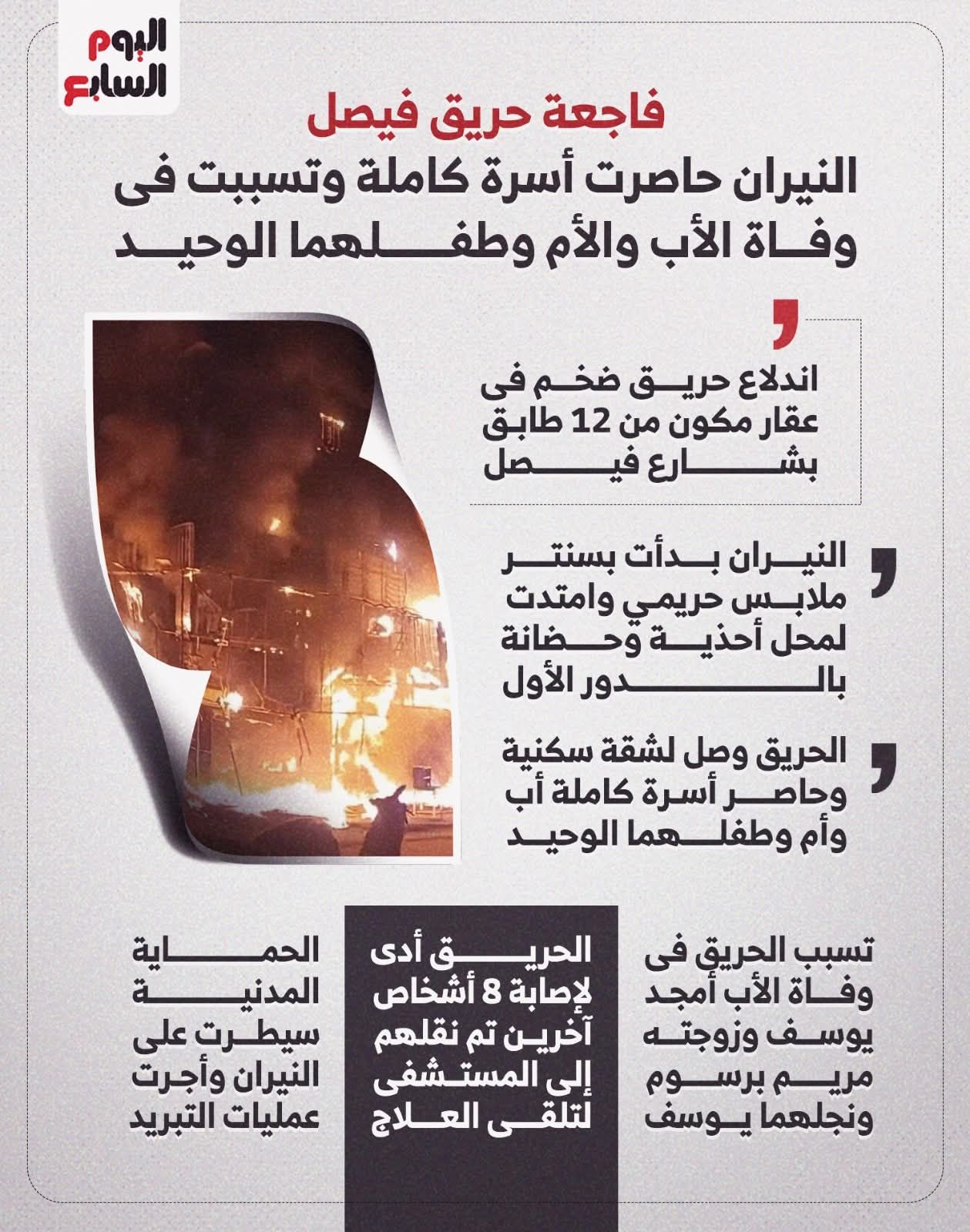الخميس، 02 أكتوبر 2025 12:15 صحاصرت النيران أسرة كاملة داخل شقتها وتسببت فى وفاة أم وأب ونجلهم فى منطقة فيصل بعدما امتد الحريق من محل حتى وصل إليهم وتسبب فى فاجعة وفاتهم ونلخص الحادث فى نقاط.
