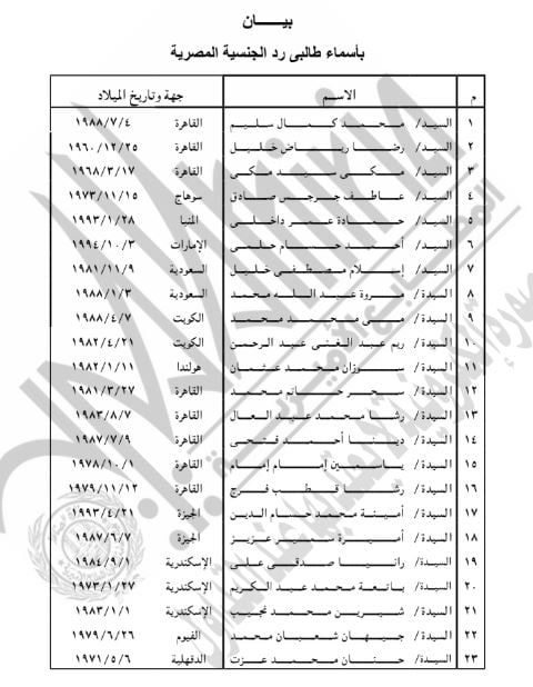 ونص القرار الذي حمل رقم 1676 لسنة 2025، على أنه ترد الجنسية المصرية لكل من الأشخاص المدرج أسماؤهم بالكشف المنشور بالجريدة الرسمية أولهم محمد كمال سليم وآخرهم حنان محمد عزت.