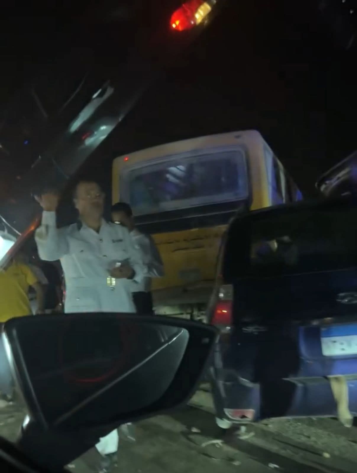 ويستمع رجال المباحث لأقوال شهود العيان والمصابين لكشف ملابسات حادث تصادم سيارات وتريلا بطريق السويس الصحراوى وجمع البيانات اللازمة حول الحادث .