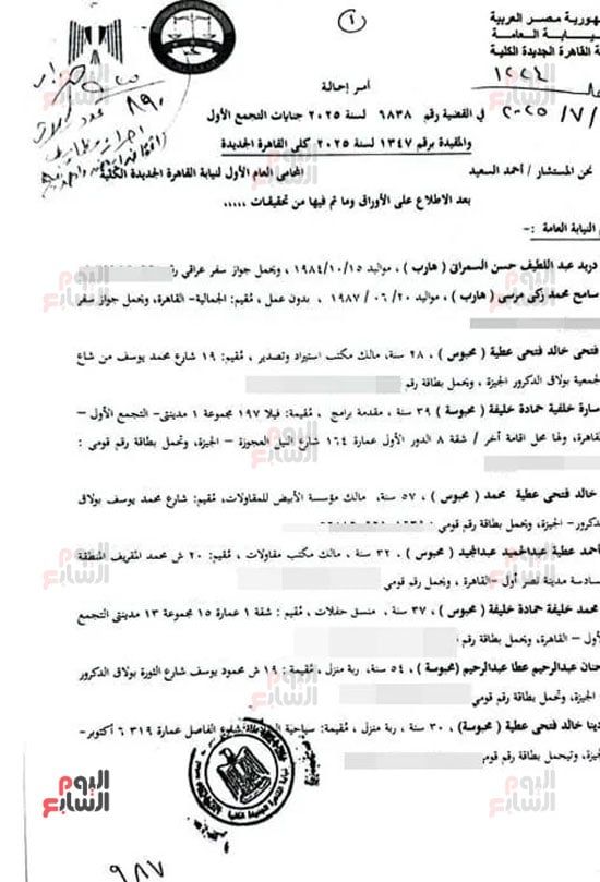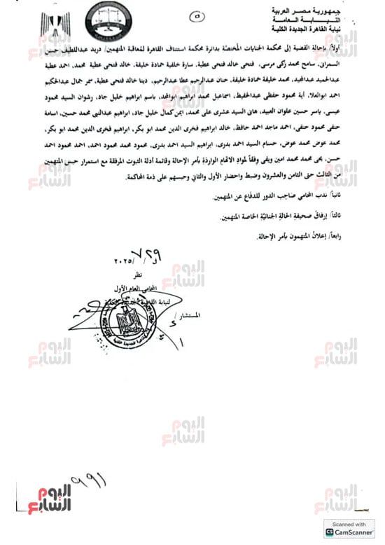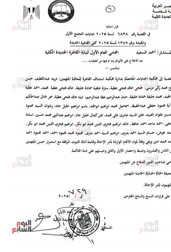 أولاً بإحالة القضية إلى محكمة الجنايات المختصة بدائرة محكمة استئناف القاهرة لمعاقبة المتهمين دريد عبداللطيف حسن السعران، سامح محمد زکی مرسی فتحی خالد فتحى عطية سارة خلفية حمادة خليفة، خالد فتحى عطية محمد احمد عطية عبد الحميد عبد المجيد محمد خليفة حمادة خليفة، حنان عبد الرحيم عطا عبد الرحيم، دينا خالد فتحى عطية، سمر جمال عبد الحكيم احمد ابو العلاء آية محمود حفظى عبد الحفيظ إسماعيل محمد إبراهيم أبو المجد باسم إبراهیم خلیل جاد، رشوان السيد محمود عیسى یاسر حسين علوان العبيد هاني السيد عشرى على محمد أيمن كمال خلیل جاد ابراهیم عبدالنبي محمد حسين، اسامة حنفی محمود حنفی احمد ماجد احمد حافظ خالد ابراهيم فخرى الدين محمد أبو بكر ابراهيم فخرى الدين محمد ابو بكر محمد عوض محمد عوض حسام السيد احمد بدری ابراهيم السيد احمد بدری محمود محمد محمود احمد، احمد محمود احمد حسن بھی محمد محمد امين ويفى وفقاً لمواد الاتمام الواردة بأمر الإحالة وقائمة أدلة الثبوت المرفقة مع استمرار حبس المتهمين من الثالث حتى الثامن والعشرون وضبط واحضار الأول والثاني وحبسهم على ذمة المحاكمة.