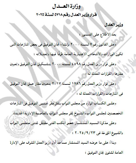 الإثنين، 03 نوفمبر 2025 09:27 صنشرت الجريدة الرسمية صباح اليوم نص قرار المستشار عدنان فنجرى وزير العدل بنقل مقر لجنتي التوفيق في بعض المنازعات لمجلسي النواب والشيوخ من مقرهما الحالي بمبنى مجلس النواب - بشارع مجلس الشعب - القاهرة، إلى المقر الجديد الكائن في مقر مجلس النواب بالعاصمة الإدارية الجديدة - الدور الثالث - زون (5) - مكتب رقم (261).