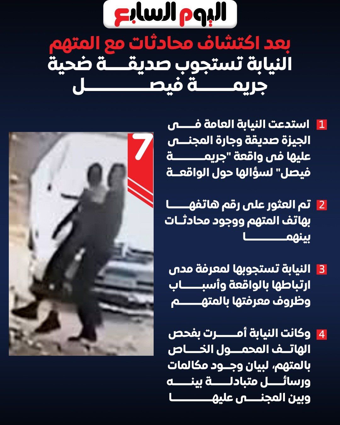 استدعت النيابة العامة في الجيزة، صديقة وجارة المجنى عليها في واقعة "جريمة فيصل" لسؤالها حول الواقعة خاصة بعد العثور على رقم هاتفها بهاتف المتهم، ووجود محادثات بينهما، لمعرفة مدى ارتباطها بالواقعة وأسباب وظروف معرفتها بالمتهم.