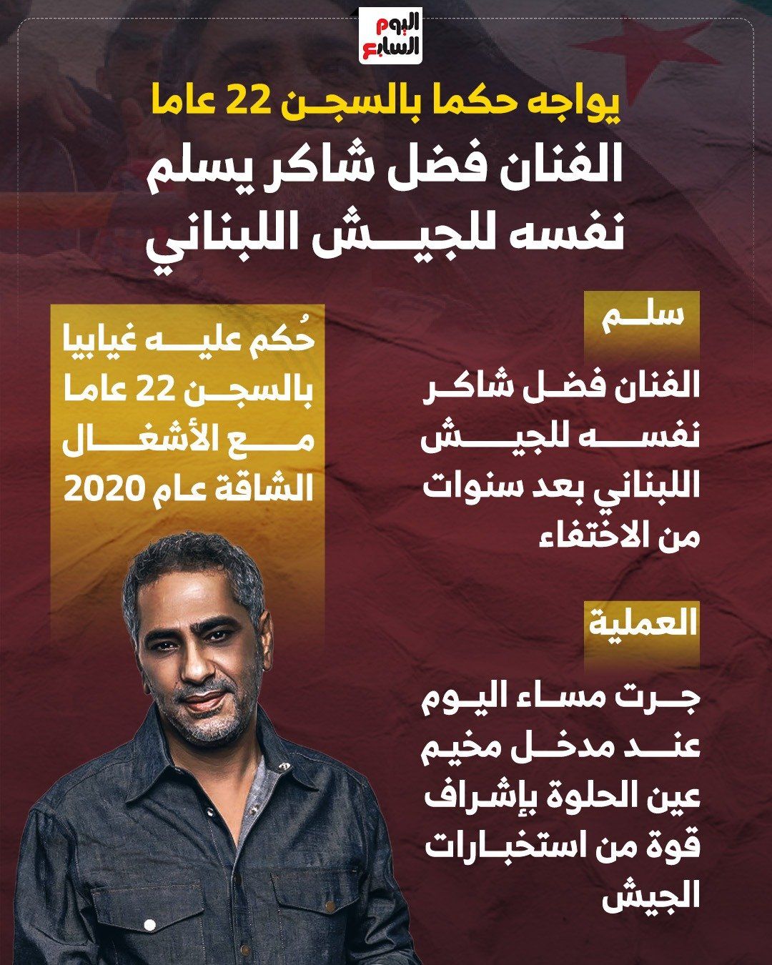 السبت، 04 أكتوبر 2025 11:35 ميستعرض اليوم السابع من خلال إنفوجراف الخبر الذي شغل الوسط الفني وجمهور فضل شاكر الذي سلم نفسه للجيش اللبناني، حيث يواجه حكما بالسجن لمدة 22 عاما.