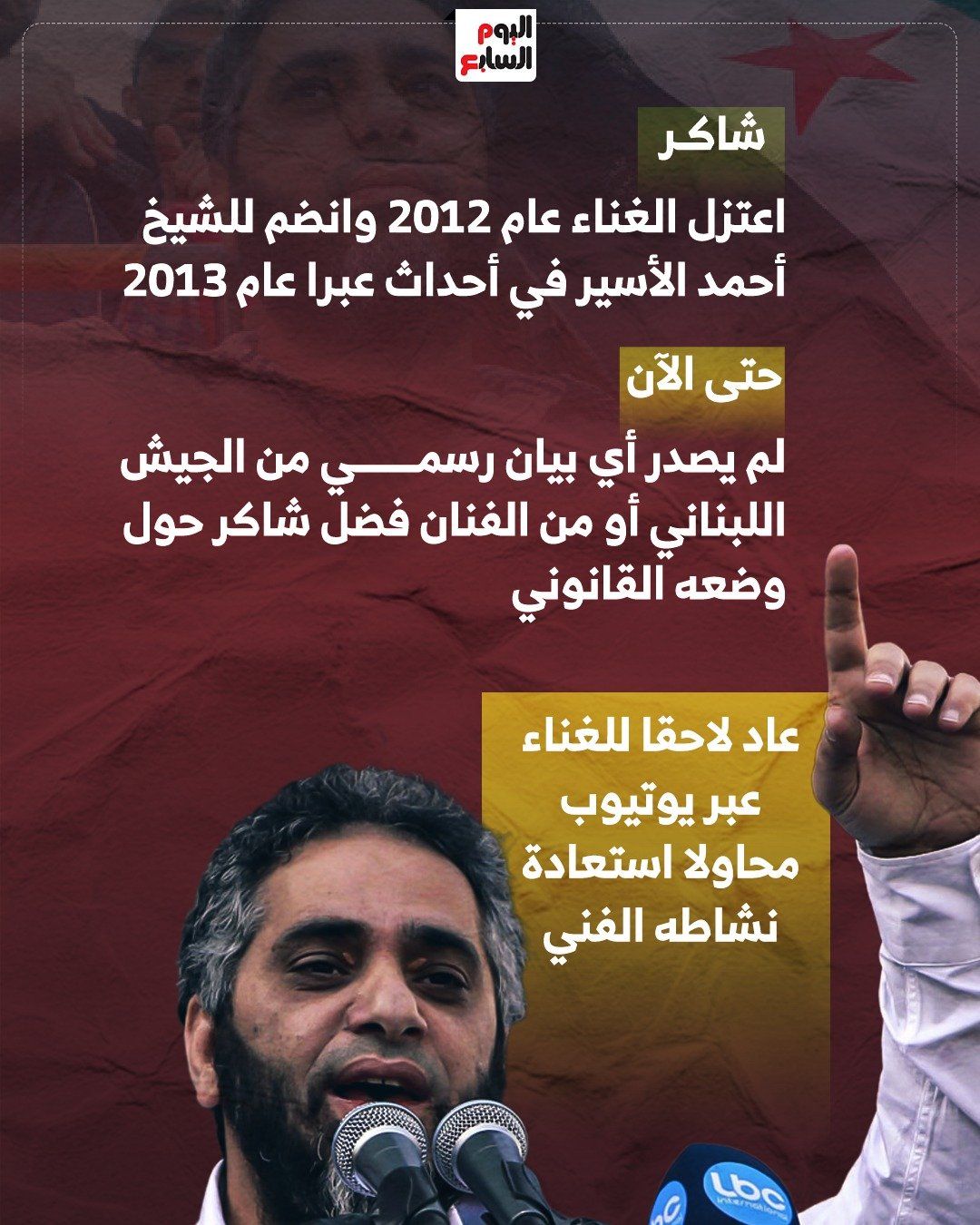 ويُعد فضل شاكر من أبرز الأسماء الفنية في لبنان والعالم العربي، وكان قد أعلن اعتزاله الغناء عام 2012 وظهر آنذاك ملتحيًا، داعيًا إلى القتال في سوريا، ومعلنًا أن فنه السابق "لم يعد يشرفه".
