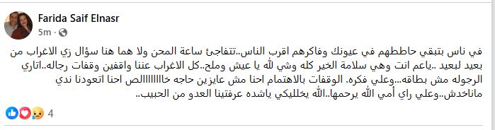 أعربت الفنانة فريدة سيف النصر عن امتنانها للشدة التى تمر بها خلال الفترة الحالية، وذلك بعد مرض شقيقها الشديد الذى تعرض لها مؤخراً، وكتبت الفنانة القديرة عبر حسابها على موقع فيس بوك : "في ناس بتبقى حاططهم فى عيونك وفاكرهم أقرب الناس.. تتفاجئ ساعة المحن ولا هما هنا سؤال زى الأغراب من بعيد لبعيد".