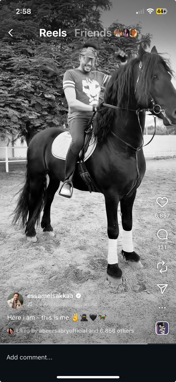 عصام السقا نشر الفيديو وهو يسير بجانب أحد الخيول الخاصة به، وأرفقه بتعليق قال فيه ما يعني باللغة الإنجليزية : " مرحباً هذا أنا ".