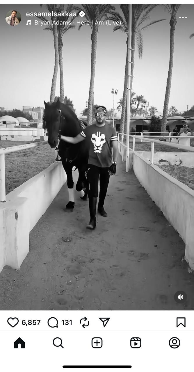 عصام السقا نشر الفيديو وهو يسير بجانب أحد الخيول الخاصة به، وأرفقه بتعليق قال فيه ما يعني باللغة الإنجليزية: "مرحباً هذا أنا".