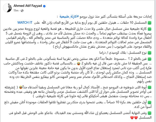 حرص أحمد عاطف فايد على التفاعل مع متابعيه عبر فيس بوك من خلال الإجابة على تساؤلات متابعيه حول برومو مسلسل كارثة طبيعية من خلال بوست بعنوان : "إجابات سريعة على أسئلة بتتسألى كتير منذ نزول برومو كارثة طبيعية ".