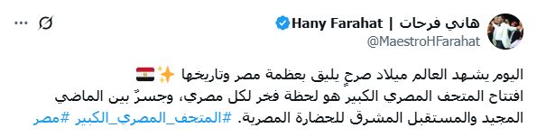 وقال فرحات، عبر حسابه على منصة X: "اليوم يشهد العالم ميلاد صرحٍ يليق بعظمة مصر وتاريخها، افتتاح المتحف المصري الكبير هو لحظة فخر لكل مصري، وجسرٌ بين الماضي المجيد والمستقبل المشرق للحضارة المصرية".