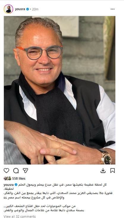 وتابعت يسرا: "فخورة جدًا بصديقي العزيز محمد السعدي، اللي دايمًا بيقدر يجمع بين الفن، والفكر، والإخلاص في كل مشروع بيحمل اسم مصر".