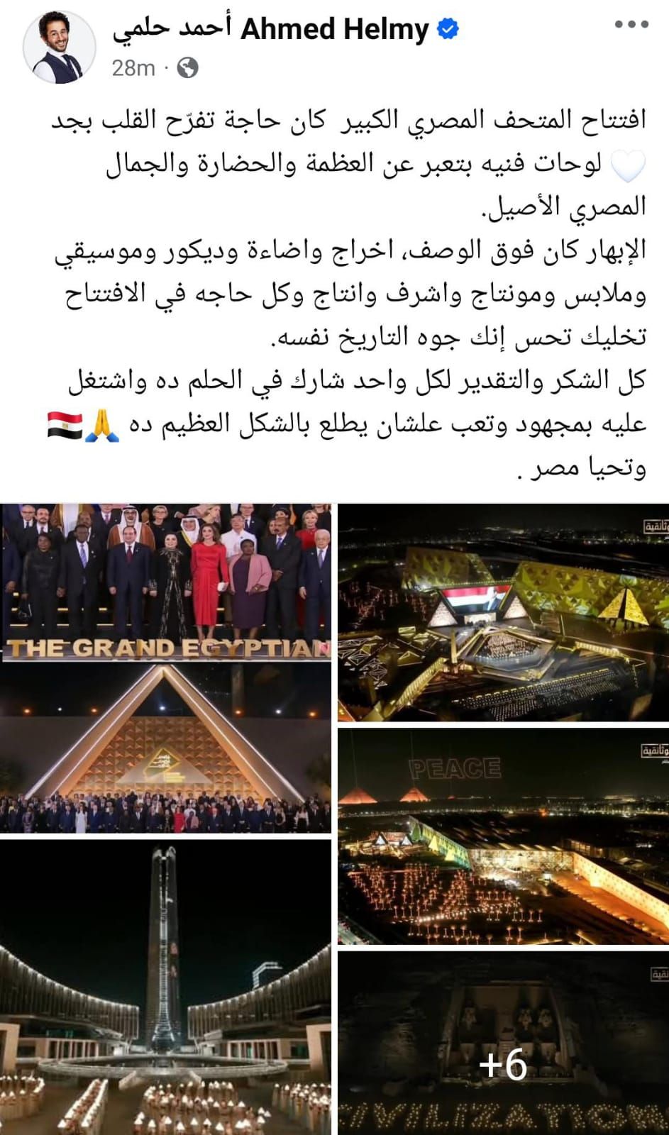 علق النجم أحمد حلمي من خلال صفحته على موقع على افتتاح المتحف المصري الكبير، قائلا، "افتتاح المتحف المصري الكبير كان حاجة تفرّح القلب بجد لوحات فنيه بتعبر عن العظمة والحضارة والجمال المصري الأصيل".