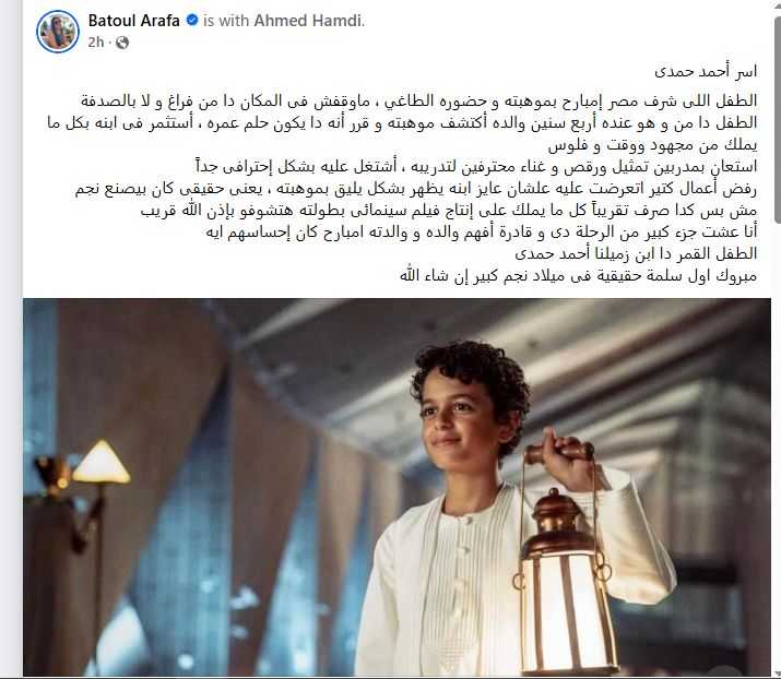 وتابعت: "رفض أعمال كتير اتعرضت عليه علشان عايز ابنه يظهر بشكل يليق بموهبته ، يعنى حقيقى كان بيصنع نجم، مش بس كدا صرف تقريباً كل ما يملك على إنتاج فيلم سينمائى بطولته هتشوفو بإذن الله قريب، أنا عشت جزء كبير من الرحلة دى و قادرة أفهم والده و والدته امبارح كان إحساسهم ايه ".