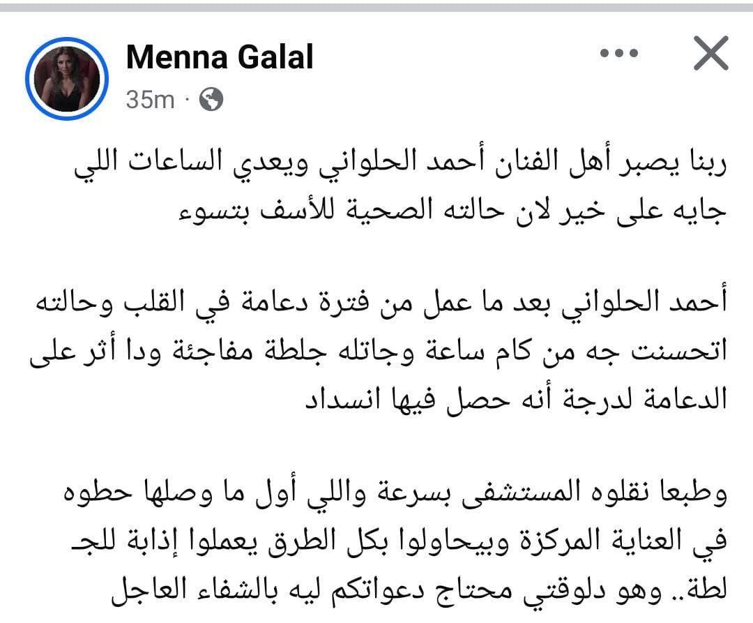 وقالت منة جلال: "أحمد الحلواني بعد ما عمل من فترة دعامة في القلب وحالته اتحسنت جه من كام ساعة وجاتله جلطة مفاجئة ودا أثر على الدعامة لدرجة أنه حصل فيها انسداد وطبعا نقلوه المستشفى بسرعة واللي أول ما وصلها حطوه في العناية المركزة وبيحاولوا بكل الطرق يعملوا إذابة للجلطة.. وهو دلوقتي محتاج دعواتكم ليه بالشفاء العاجل".