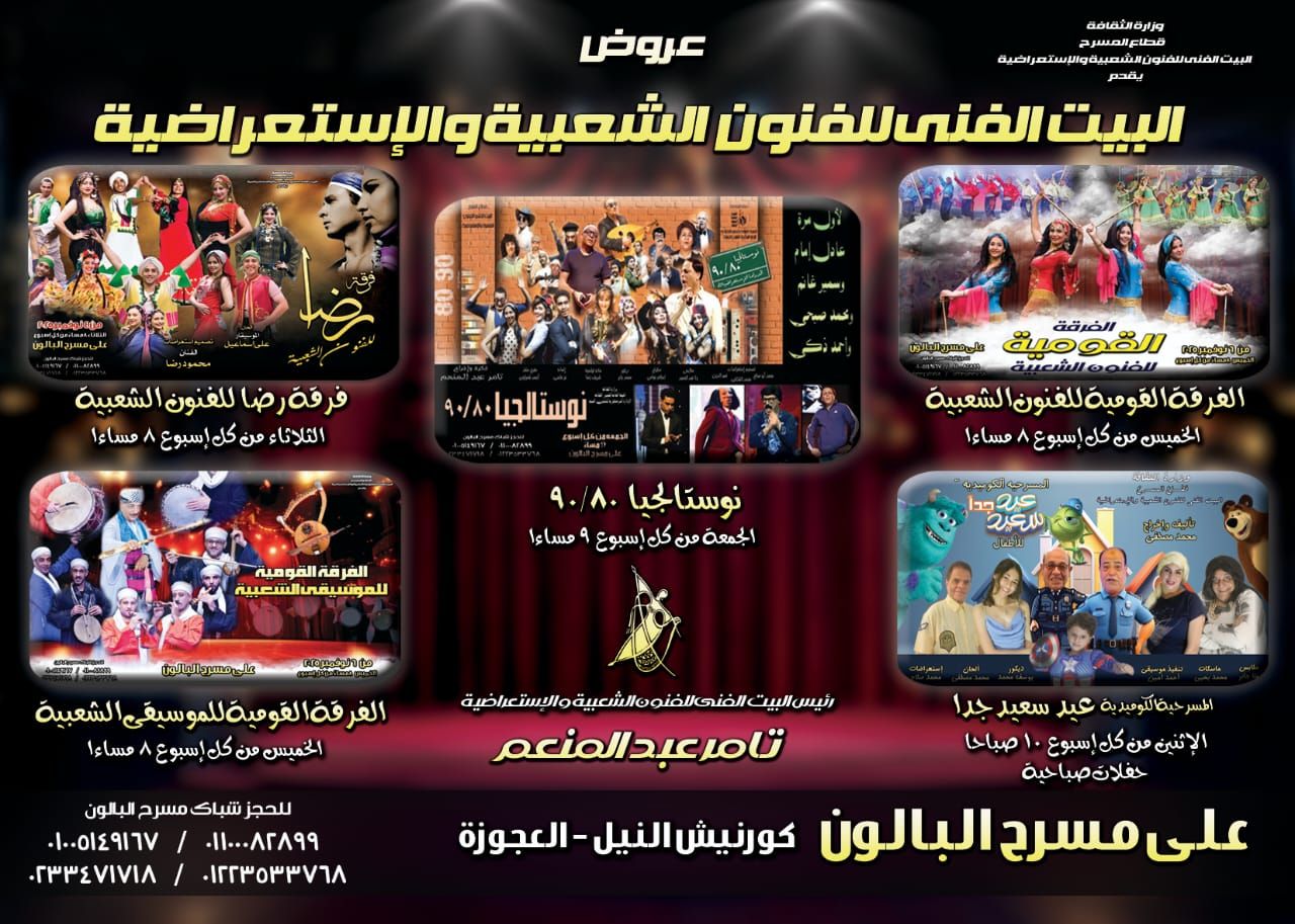 بينما تقدم فرقة رضا للفنون الشعبية فقراتها يوم الثلاثاء من كل أسبوع بينما يعرض مسرح البالون مسرحية الأطفال عيد سعيد جدا كل اثنين صباحا للنجمين رضا إدريس وحسن عبد الفتاح وإخراج محمد مصطفى.