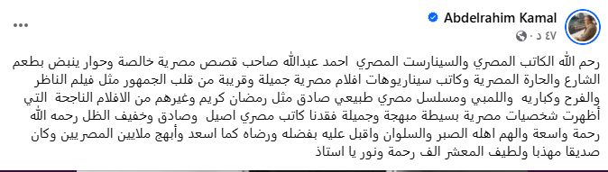 وقال كمال، عبر حسابه على : رحم الله الكاتب والسينارست المصري أحمد عبد الله، صاحب قصص مصرية خالصة وحوار ينبض بطعم الشارع والحارة المصرية وكاتب سيناريوهات أفلام مصرية جميلة وقريبة من قلب الجمهور مثل الناظر والفرح وكباريه واللمبي ومسلسل مصري طبيعي صادق مثل كريم وغيرهم من الأفلام الناجحة التي أظهرت شخصيات مصرية بسيطة مبهجة وجميلة.