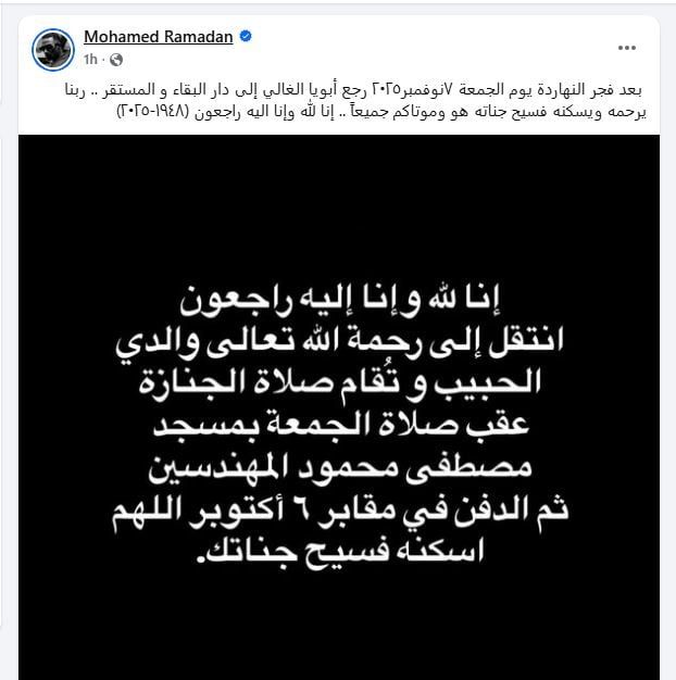 وكان الفنان محمد رمضان أعلن عن وفاة والده صباح اليوم الجمعة، قائلاً: "بعد فجر النهاردة رجع أبويا الغالي إلى دار البقاء والمستقر، ستقام صلاة الجنازة عقب صلاة الجمعة بمسجد مصطفى محمود المهندسين، ثم الدفن بمقابر العائلة في 6 أكتوبر، ربنا يرحمه ويسكنه فسيح جناته هو وموتاكم جميعاً .. إنا لله وإنا اليه راجعون".