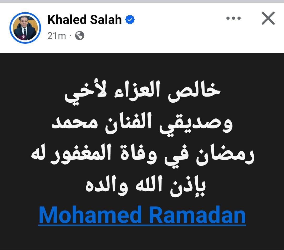 الجمعة، 07 نوفمبر 2025 01:36 موجه الكاتب الصحفى خالد صلاح واجب التعازى للفنان محمد رمضان فى وفاة والده، من خلال حسابه على موقع فيس بوك، حيث كتب "خالص العزاء لأخى وصديقى الفنان محمد رمضان فى وفاة المغفور له بإذن الله والده".