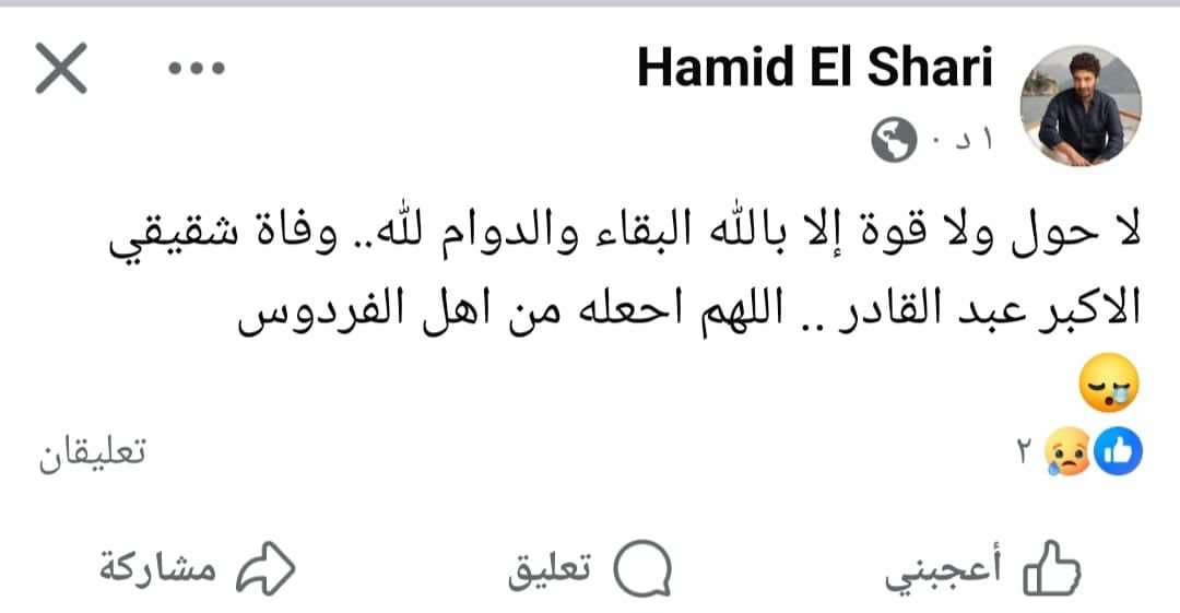 أعلن الفنان حميد الشاعري وفاة شقيقه الأكبر عبد القادر الشاعري، حيث نشر عبر صفحته الرسمية على موقع التواصل الاجتماعي "" منشورًا قال فيه: "لا حول ولا قوة إلا بالله، البقاء والدوام لله.. وفاة شقيقي الأكبر عبد القادر.. اللهم اجعله من أهل الفردوس الأعلى."