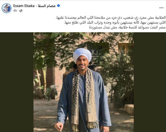نشر الفنان عصام السقا عبر حسابه على الفيس بوك قائلا: الجلابية مش مجرد زي شعبي، دي جزء من ملامحنا اللي العالم بيحسدنا عليها.