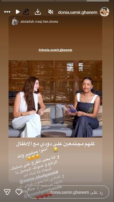 الأحد، 09 نوفمبر 2025 08:35 منشرت الفنانة هنادي مهنا، مقطع فيديو جمعها بالفنانة أسماء أبو اليزيد، وقامت أسماء أبو اليزيد بسؤال هنادي مهنا عن "العيلة اللي ملهاش في المشاكل، حيث اختارت أسماء أبو اليزيد الفنان سمير غانم، فيما اختارت هنادي مهنا عائلة سمير غانم بالكامل عائلة لا تحب المشاكل ولا تفتعلها، وردت دنيا سمير غانم "انتوا حبايبي" وأثنت على أسماء أبو اليزيد وقالت لهنادي مهنا بموت فيكي.