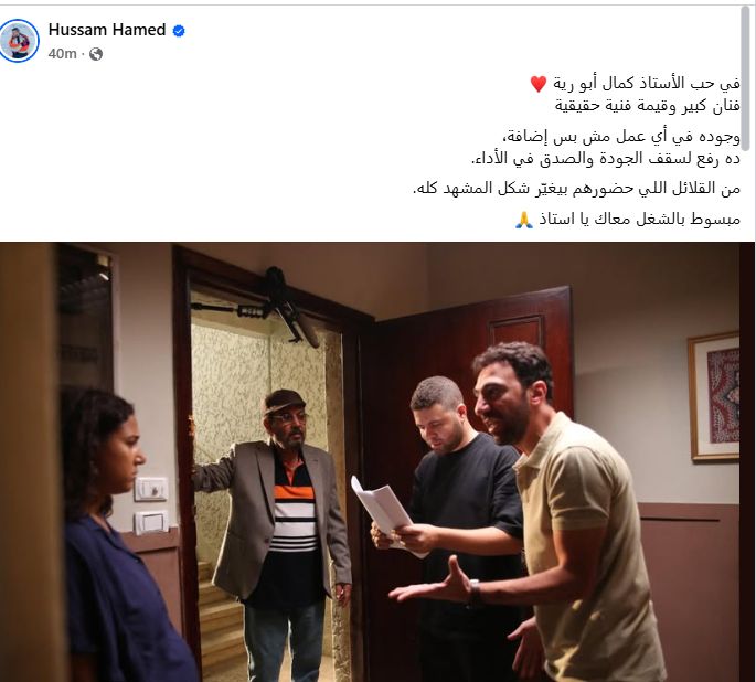 ثم استكمل عن تأثيره فى المسلسل: "من القلائل اللي حضورهم بيغيّر شكل المشهد كله، مبسوط بالشغل معاك يا أستاذ".