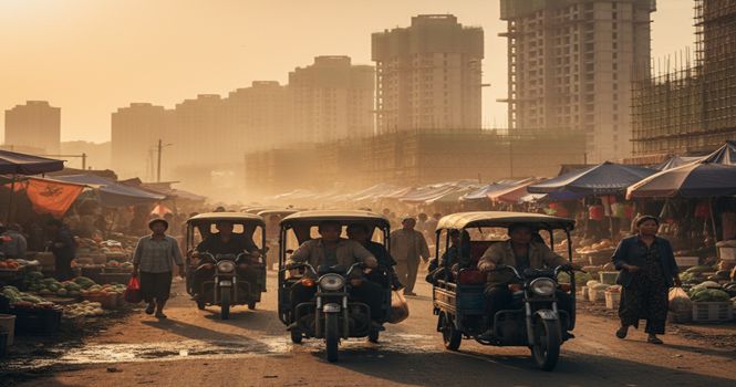 وفي قلب المدينة، يتدفق عمال يوميون إلى مواقع البناء في الأبراج الشاهقة، حيث يعملون دون عقود رسمية أو حماية اجتماعية.