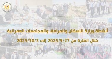 نشرت الصفحة الرسمية لوزارة الإسكان والمرافق والمجتمعات العمرانية تقريراً بالفيديوجراف تتضمن أنشطة الوزارة خلال الفترة من 27/9/2025 إلى 2/10/2025.