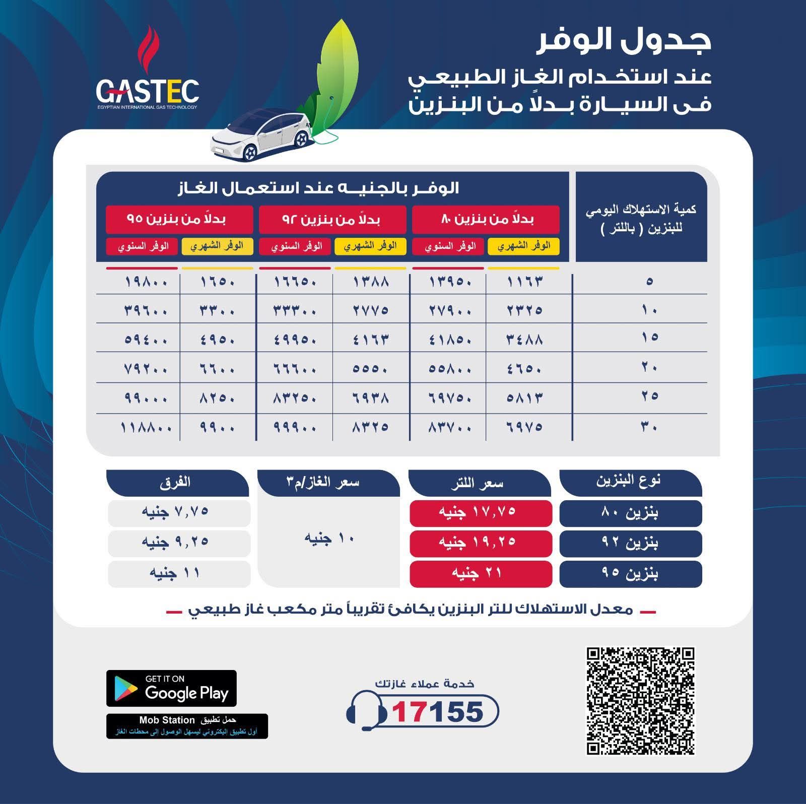 وفى حالة استخدام المواطن للغاز الطبيعى فى سيارته، فإنه يمكن له تحقيق وفر يصل لحوالى 2775 جنيها شهريًا عند متوسط استهلاك يومى 10 لتر بنزين "92" أو توفير 33300 جنيها سنويا بينما يصل معدل التوفير لحوالى 3300 جنيه شهريًا فى حالة استخدام بنزين "95" أو توفير 39600 جنيها سنويا.