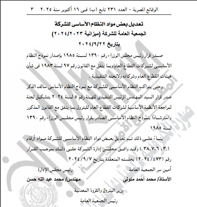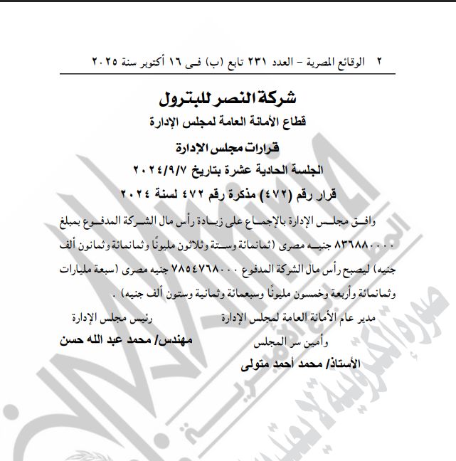 نشرت جريدة الوقائع المصرية فى العدد 231 تابع (ب) في 16 أكتوبر سنة 2025 قرارات مجلس الإدارة لشركة النصر للبترول لقطاع الأمانة العامة لمجلس الإدارة الجلسة الحادية عشرة بتاريخ 7-9-2025.