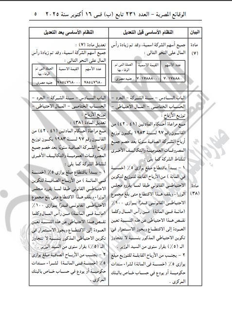 قرار رقم (472) مذكرة رقم 472 لسنة 2024 حيث وافق مجلس الإدارة بالإجماع على زيادة رأس مال الشركة المدفوع بمبلغ 836880000 جنيه مصرى ( ثمانمائة وستة وثلاثون مليونا وثمانمائة وثمانون ألف جنيه) ليصبح رأس مال الشركة المدفوع 7854768000 جنيه مصرى (سبعة مليارات وثمانمائة وأربعة وخمسون مليونًا وسبعمائة وثمانية وستون ألف جنيه).