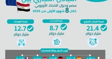كما أظهرت بيانات الجهاز ارتفاع حجم التبادل التجارى بين مصر ودول الاتحاد الأوروبى ليصل إلى 21.4 مليار دولار من يناير حتى أغسطس 2025 مقابل 21.8 مليار دولار خلال نفس الفترة من عام 2024.
