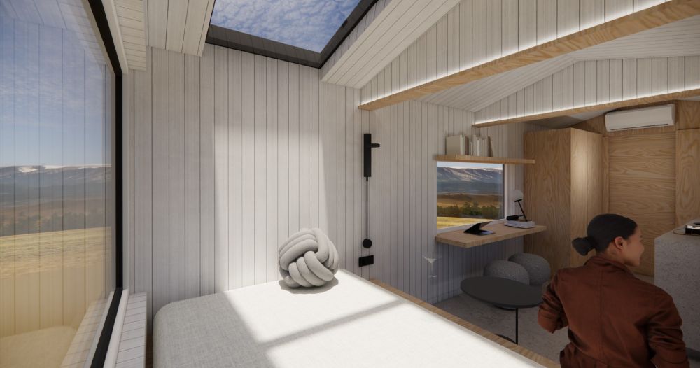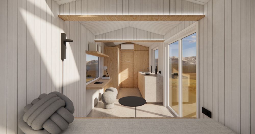 ويعتمد تصميمه على مفهوم المساحات المفتوحة، حيث تتداخل غرفة المعيشة وغرفة النوم في مساحة واحدة، مع مطبخ صغير مضغوط يحتوي على الحد الأدنى من وحدات التخزين.