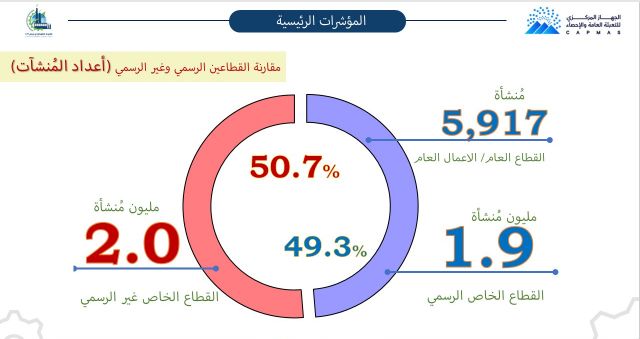 وتناول التعداد الاقتصادي نسب استحواذ القطاعين الرسمي وغير الرسمي على اعداد المنشآت والمشتغلين، حيث بلغ عدد المنشآت في القطاع غير الرسمي نحو مليوني منشأة، مقابل 1.9 مليون منشأة للقطاع الخاص الرسمي، وبلغ عدد المشتغلين في القطاع الخاص الرسمي 10.4 مليون مشتغل، مقابل 3.9 مليون مشتغل بالقطاع الخاص غير الرسمي.