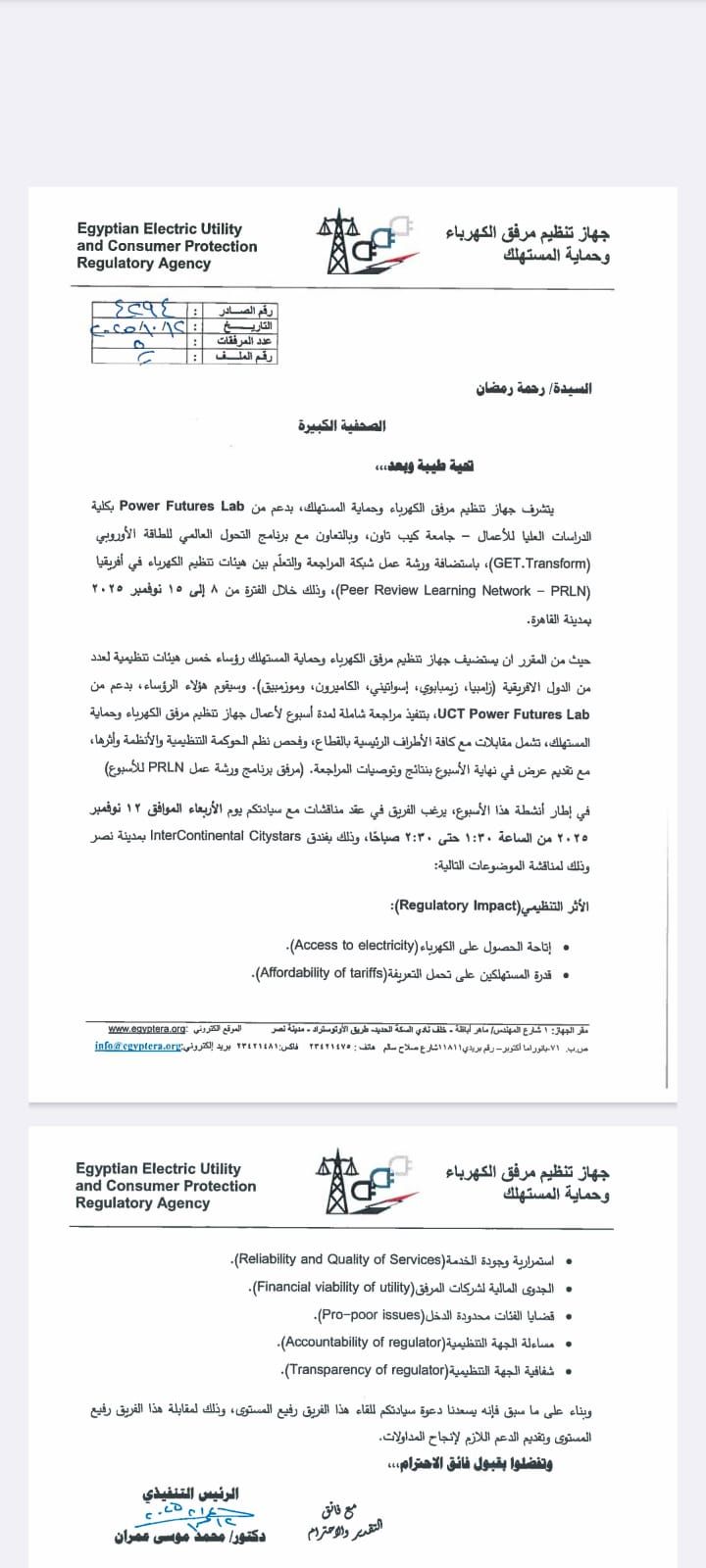 يستضيف جهاز تنظيم مرفق الكهرباء وحماية المستهلك، بدعم من Power Futures Lab بكلية الدراسات العليا للأعمال - جامعة كيب تاون، وبالتعاون مع برنامج التحول العالمي للطاقة الأوروبي (GET.Transform)، ورشة عمل شبكة المراجعة والتعلم بين هيئات تنظيم الكهرباء في أفريقيا وذلك خلال الفترة من 8 إلى 15 نوفمبر بمدينة القاهرة.