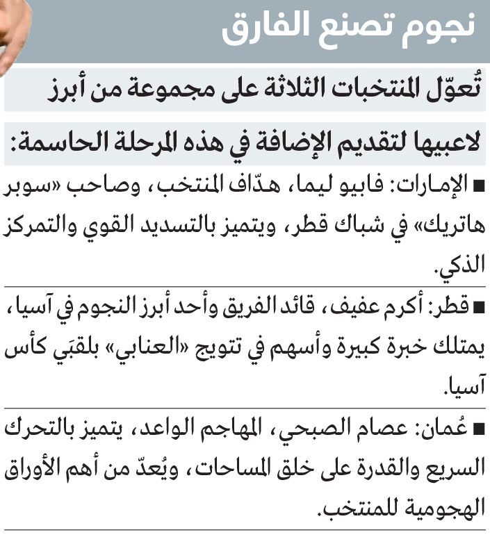 وتُسلط «الإمارات اليوم» الضوء على أوضاع المنتخبات الثلاثة قبل انطلاق التصفيات الحاسمة.