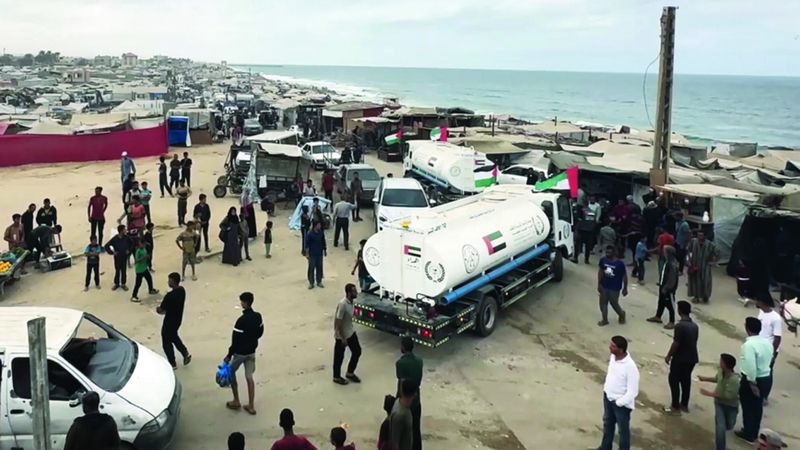 سلمت عملية «الفارس الشهم 3» 21 صهريج مياه، إلى مصلحة مياه بلديات الساحل في قطاع غزة، للإسهام في تأمين المياه للأسر المتضررة والمناطق التي تعاني شحاً حاداً في المياه، وسد العجز الذي تواجهه الهيئات المحلية في ظل الأوضاع الإنسانية الصعبة. وذلك في إطار جهود دولة الإمارات الإغاثية والإنسانية المستمرة لدعم الشعب الفلسطيني في قطاع غزة. وتغطي هذه الصهاريج احتياجات نحو 200 ألف نسمة، إذ تنقل نحو 150 ألف لتر من المياه في كل رحلة، وتبلغ سعة كل صهريج 10 أمتار مكعبة، بما يسهم في ضمان وصول المياه المحلاة إلى مختلف المناطق، ويعكس التزام دولة الإمارات الدائم بدعم السكان والتخفيف من آثار الأزمة على حياتهم اليومية.
