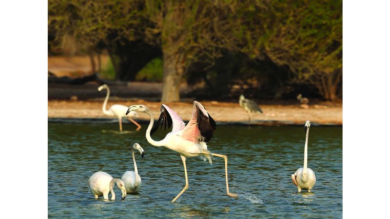 فارداً جناحيه وكأنه يستعد للتحليق فوق مياه بحيرات القدرة في دبي، أحد طيور الفلامنجو (النحام) يستعرض جماله ورشاقته، ويزهو بألوانه البيضاء والوردية في هذا الفضاء، والموائل الآمنة التي تشبه البيئات الطبيعية التي تحتضن تلك الكائنات المهاجرة الوادعة التي وجدت مستقرها هنا في وسط يحترم التنوع البيولوجي ويحرص على الحفاظ على الأنواع من أجل الاستدامة، وتوفير كل ما يلزم من أجل بقاء كل ما يجمّل كوكب الأرض.