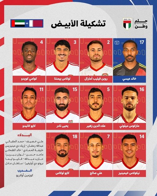 تنطلق الساعة 9:15 من مساء اليوم الثلاثاء المباراة الحاسمة على التأهل لنهائيات كأس العالم 2026 بين المنتخب الإماراتي ونظيره القطري على استاد جاسم بن حمد في الدوحة، ضمن الملحق الآسيوي.