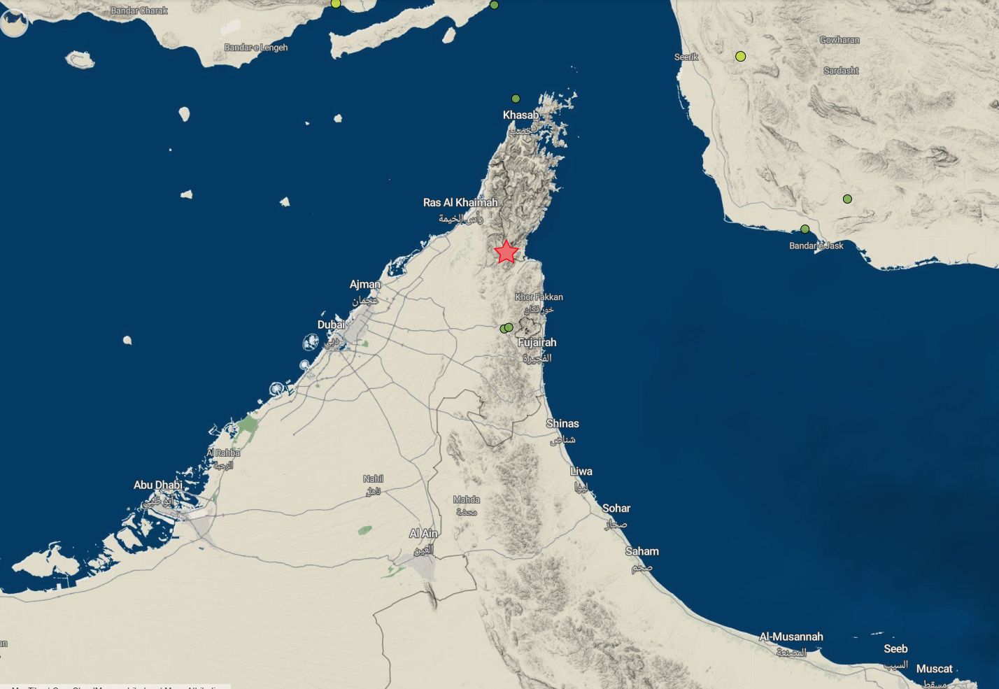 سجلت محطات الشبكة الوطنية لرصد الزلازل التابعة للمركز الوطني للأرصاد، هزةً بقوة 4.6 درجات جنوب مسندم اليوم الساعة 16:40 حسب التوقيت المحلي لدولة الإمارات، وكانت محسوسة في المنطقة وليس لها تأثير.