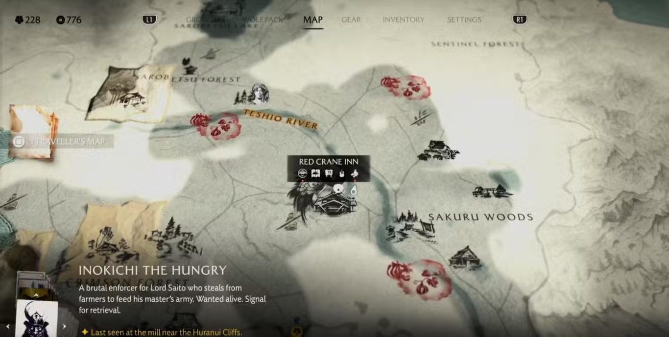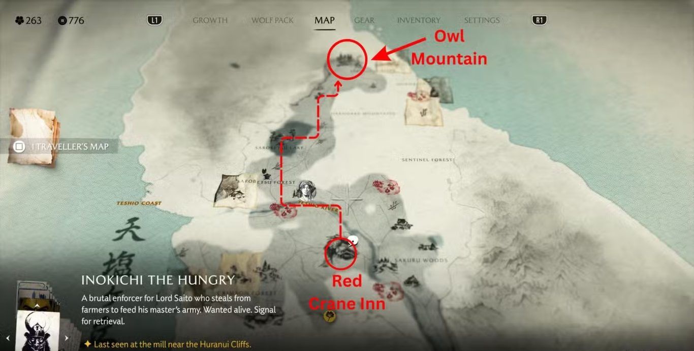 في الوقت نفسه، ستجد على الخريطة علامة لمكان Red Crane Inn وهو موقع رئيسي في القصة، لكنك لست مضطرًا إلى الدخول وبدء الجزء السردي مباشرة. يكفي الوصول إلى النُزل لفتحه كنقطة تنقل سريع Fast Travel Point مما يسهل عليك الرحلات التالية ويجعل الطريق إلى جبل Owl أكثر اختصارًا.