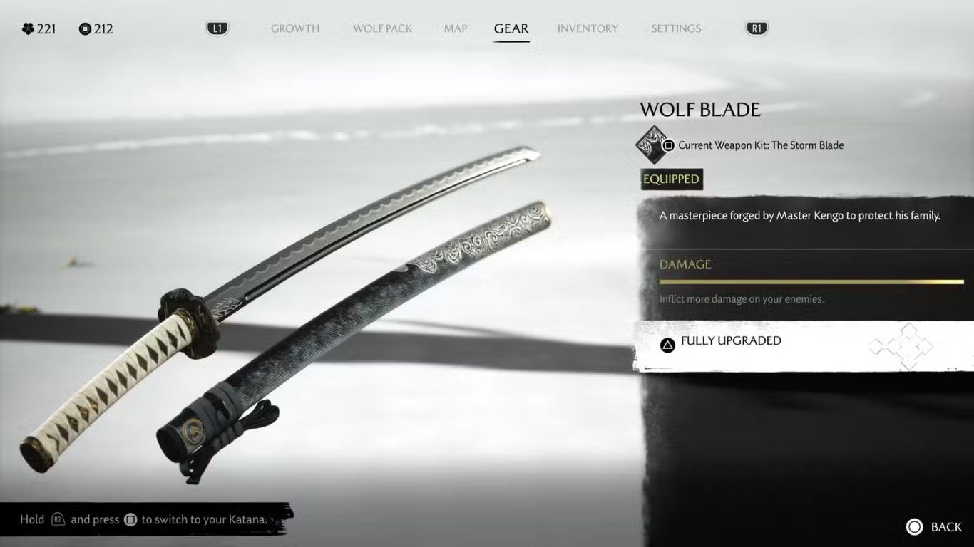 مع تقدم القصة يمكن ترقية Wolf Blade عبر الحدادين أو المعلمين (Senseis) لزيادة قوته وتحسين قدراته الهجومية، مما يحافظ على قيمته حتى المراحل المتقدمة. ويُقال إن هذا السيف يحمل نقوشًا رمزية تمثل ذئبًا يابانيًا أسطوريًا، في إشارة إلى روح Atsu الحرة التي لا تنكسر.