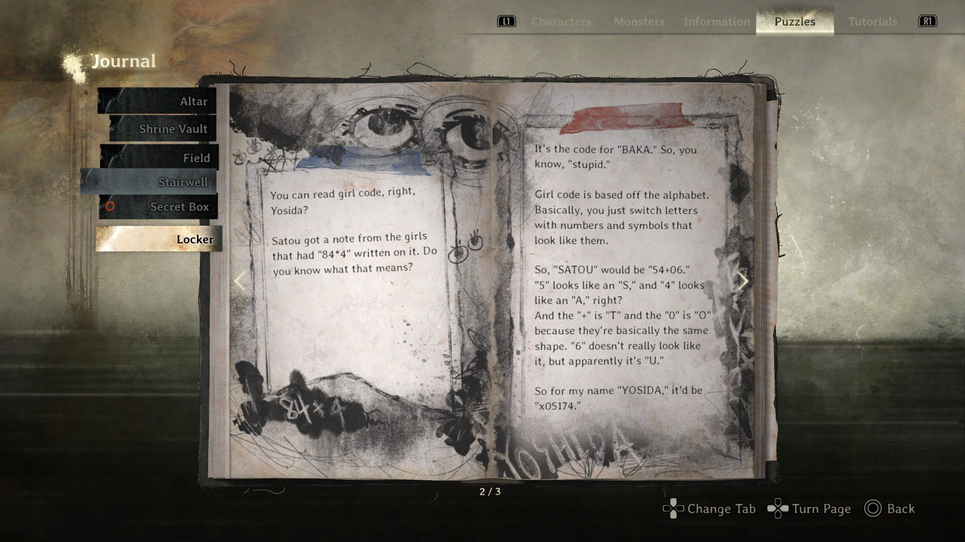 لفك رموز جميع خزائن المدرسة، عليك تتبع سلسلة من “أوريغامي الشكاوى” التي كتبتها طالبات المدرسة، حيث دوّنّ فيها رموز فتح الخزائن. لكن هذه الرموز ليست مباشرة، بل مشفّرة بطريقة خاصة لا يمكن فهمها إلا بعد قراءة التفسير الموجود في الممر الشمالي الشرقي من الطابق الثاني. أما مفتاح غرفة الخزائن في الطابق الأول، فيمكن العثور عليه في الغرفة الشرقية القصوى من نفس الممر.