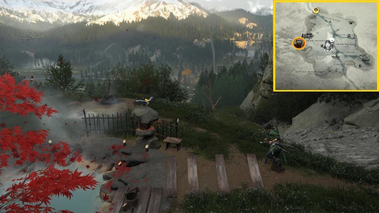 عندما تصل إلى منطقة Nayoro Wilds، ستجد هناك ينبوعًا ساخنًا يمكنك فتحه. اتجه غربًا من مستوطنة Husko Kotan واتبع مسار الزهور البيضاء المتفتحة. تسلّق الجرف وادخل الكهف، حيث يؤدي المسار الأيسر إلى مذبح يمنحك نقطة مهارة، بينما يؤدي المسار الأيمن إلى بركة الاستحمام.