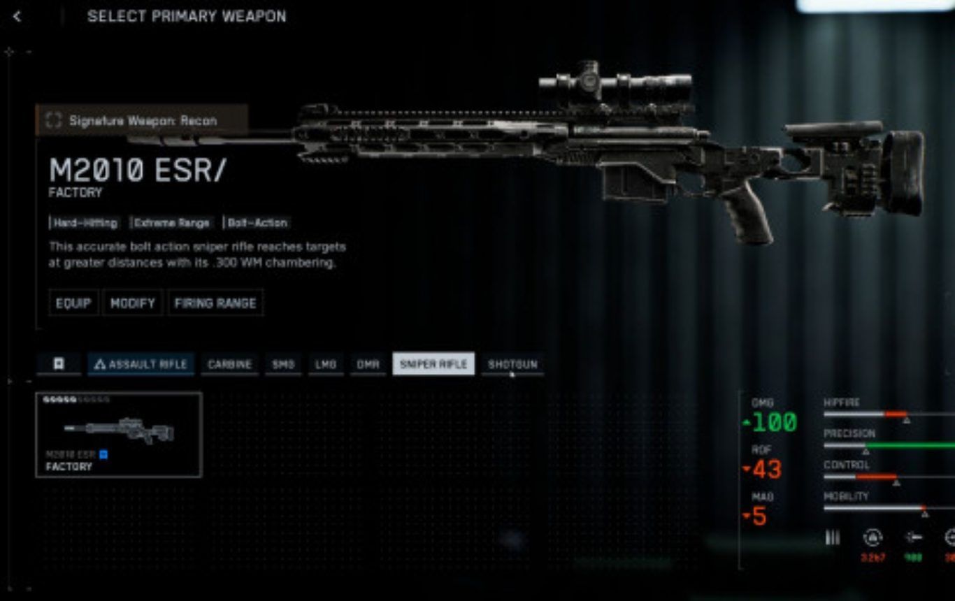- M2010 ESR — هذه البندقية القنّاصة العاملة بنظام الإغلاق بالزرّ (bolt-action) تتميز بدقة فائقة وتستطيع الوصول إلى أهداف على مسافات بعيدة بفضل غرفة .300 WM الخاصة بها. هي خيار مثالي للقنّاص الذي يريد مزيجًا من مدى هجوم واسع ودقة مضمونة عند التعامل مع الأهداف على الخطوط الخلفية.