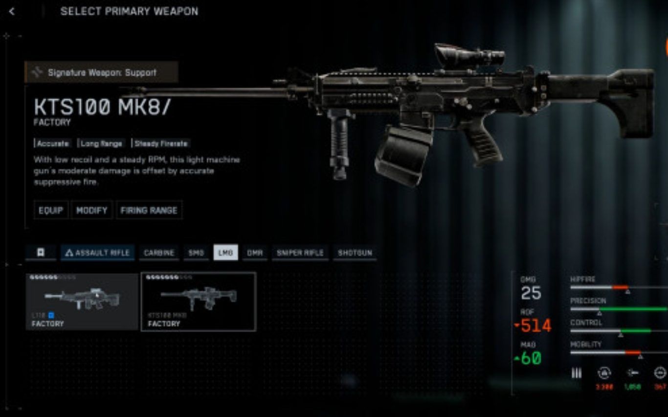 - M123K — LMG مُصمّم للدعم الناري المتحرك؛ يجمع بين قدرة عالية على الحركة ومعدل إطلاق مرتفع يجعله مُهيمناً في الاشتباكات القريبة مع الحفاظ على فاعلية قمعية. إنه الخيار الأمثل للاعبين الذين يحبون مزيجًا من الحركة والثقيل الناري دون التخلي عن القدرة على المناورة.