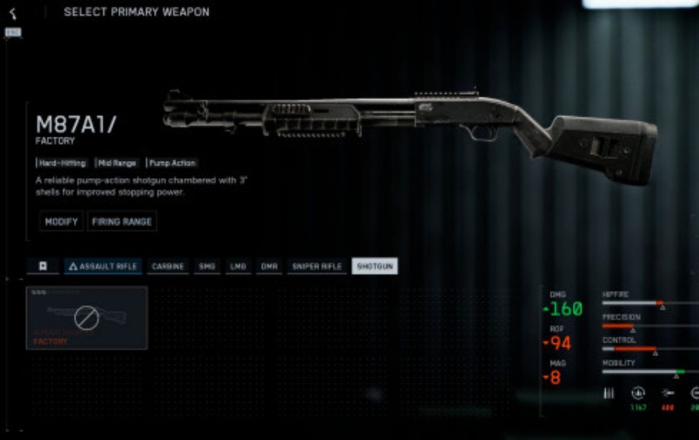 - M87A1 — بندقية خرطوش موثوقة تعمل بنظام الضخّ (Pump-Action)، تُستخدم ذخائر بقياس 3 بوصات لزيادة قوة الإيقاف عند كل طلقة. تُمثّل خيارًا كلاسيكيًا فعّالًا في القتال القريب، حيث يمكنها إسقاط الأعداء بضربة واحدة على مسافات قصيرة، وتُعد مثالية للهجوم المباشر واقتحام الغرف.